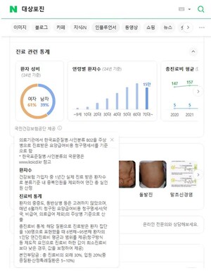 [의학신문·일간보사=이재원 기자] 국민건강보험공단(이하 건보공단, 이사장 정기석)은 네이버와 협업하여 국민이 일상적으로 사용하는 검색 플랫폼을 통해 보다 쉽고 편리하게 질병에 관한 통계 정보를 확인할 수 있도록 지난 21일부터 대국민 ‘진료 관련 통계’ 서비스를 새롭게 시작했다고 밝혔다.이는 건보공단이 보유한 방대한 건강보험 빅데이터를 바탕으로 신뢰할 수 있는 통계정보를 투명하게 제공함으로써 국민의 알권리를 보장하고 정보에 근거한 합리적인 의료이용을 지원하기 위함이다.이번 서비스는 국민들이 네이버를 통해 자주 검색하는 관심 질환 중
