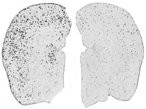 ▶ 알츠하이머 모델 마우스의 뇌 절편. IL_12/23 분자가 결핍되거나 또는 신호경로가 감소되면 알츠하이머-유사 병리소견이 감소된다. 사진의 베타 아밀로이드(검은점) 판이 감소되었다. 좌측은 알츠하이머 마우스의 뇌 반구, 우측은 IL-12 수용체가 없는 알츠하이머 마우스의 뇌 반구, 아밀로이드가 65% 정도 감소하였으며, 인지능력저하가 감소되었다. |