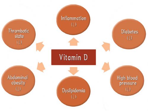 비타민 D는 지방조직에 대한 높은 친화력으로 인하여 비만한 경우에는 체내 지방조직 내에 가둬지게 되어 혈중 비타민 D 농도는 감소하게 된다. 또한 비타민 D가 지방세포의 분화를 저해시켜 지방조직의 발달을 방해한다는 보고도 있다. 이와 같이 비만과 비타민 D는 밀접한 관련성이 있다. 대사증후군의 한 요소인 고혈압과 비타민 D와 관련성에 대해서는 비타민 D 결핍인 경우 고혈압 발생이 증가하는 것으로 알려져 있다. 이에 대한 기전으로는 활성 비타민 D인 1,25(OH)2 vitamin D에 의한 renninangiotensin system 억제가 주된 역할을 하는 것으로 알려져 있다.