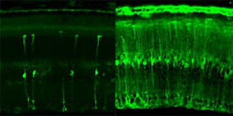 | ▲ 망막세포에 녹색형광을 표지한 바이러스가 들어간 사진. (왼쪽은 기존의 바이러스 전달방법, 오른쪽은 이번에 개발한 유전자치료용 바이러스 망막의 가장 바깥쪽에 있는 중요한 광수용체를 표적으로 녹색형광이 이동하였다.유씨버클리 제공) |