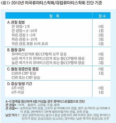 진단분류기준 중에 가장 널리 알려져 있는 것은 1987년 미국류마티스학회(ACR)에서 제정한 기준이다. 7가지 항목 중에 4가지 이상을 만족해야 하며, 반드시 6주 이상 지속되어야 류마티스관절염으로 진단할 수 있다. 그러나 이 진단기준은 병이 상당부분 진행해야 나타나는 증상들을 기초로 하고 있어서 류마티스관절염의 조기 진단에는 많은 어려움이 있었다. 이를 수정하기 위해 2010년에 미국 류마티스학회와 유럽 류마티스학회(이하 EULAR)에서 공동으로 새로운 진단분류기준을 제시하였다<표1>.