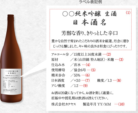 따라서 사케를 선택할 때, 라벨에 적혀 있는 정보를 이해하면 많은 도움이 된다. 반드시 표시해야 하는 필수기재사항과 임의로 기재하는 사항으로 나누어진다.