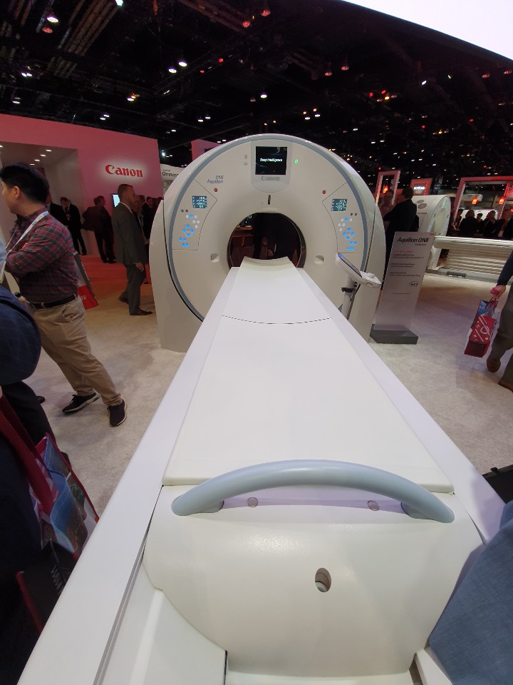 글로벌 최초로 소개돼 오는 2020년 국내 출시될 예정인 애퀼리언 원 프리즘(Aquilion ONE PRISM)은 AiCE를 기본 탑재한 캐논 메디칼의 하이엔드 최고 사양 CT이다. AiCE를 이용한 검사 적용 범위는 기존의 심장, 폐 외에 뇌, 근골격까지 확대됐다.