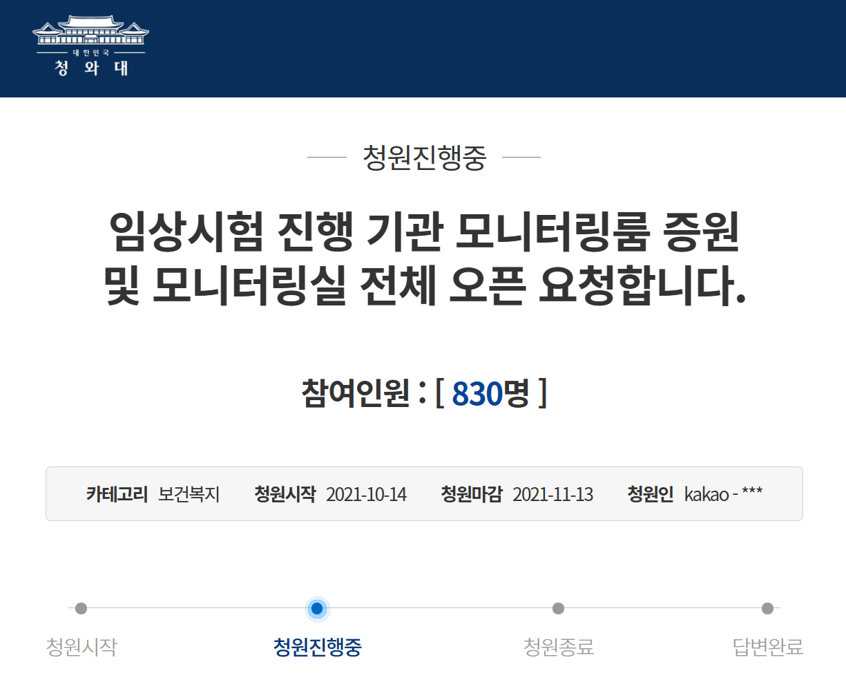 청와대 국민청원은 최근 ‘임상시험 진행 기관 모니터링룸 증원 및 모니터링실 전체 오픈’을 요청한다는 게시글이 올라왔다.