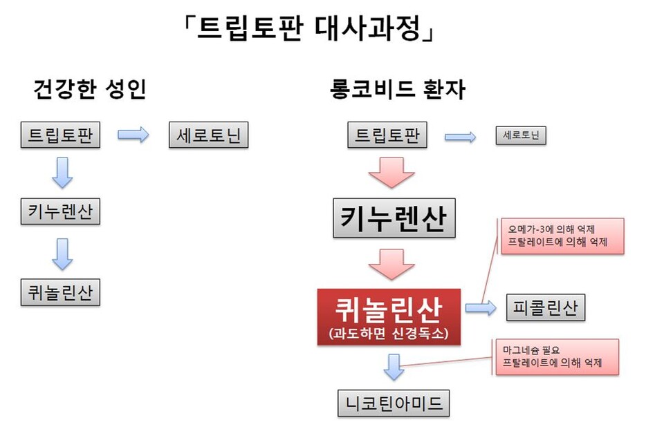 정상적으로 몸에 들어온 트립토판의 95% 정도는 키누렌산이라는 물질로 전환이 되고 나머지는 단백질 합성 또는 우울증과 관련된 세로토닌의 합성에 사용된다. 그런데 과도한 스트레스나 염증, 감염 등이 있는 경우에는 트립토판을 키누렌산으로 전환시키는 효소가 더욱 증가하게 된다.