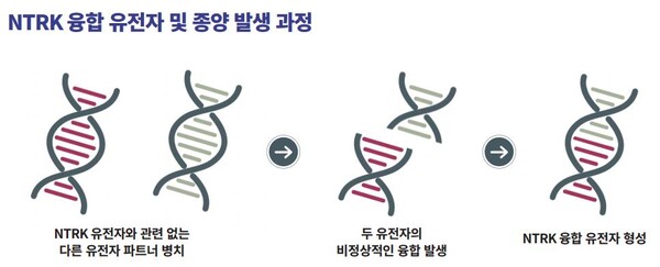 만일 이 NTRK 유전자가 다른 유전자와 비정상적으로 융합하면 사람의 신경계 발달과 기능에 필수적인 역할을 하는 TRK 수용체가 이상 발현하면서 종양의 성장을 촉진하는 발암의 요인으로 작용하는 것으로 알려져 있다.