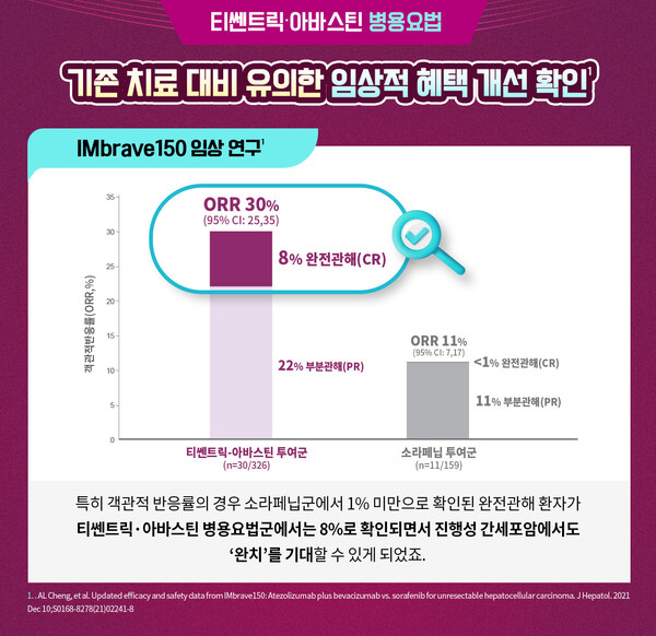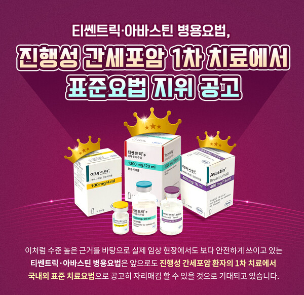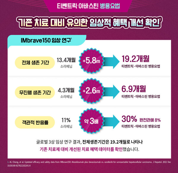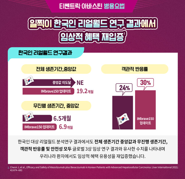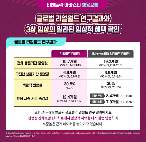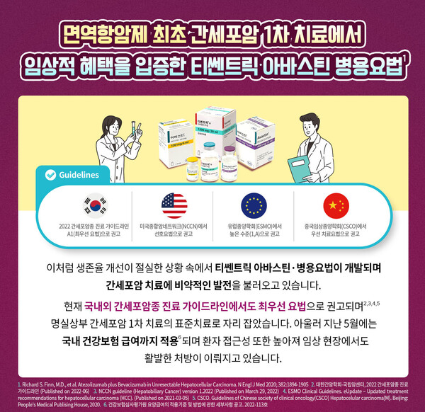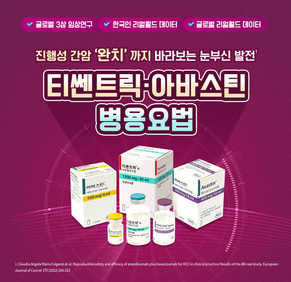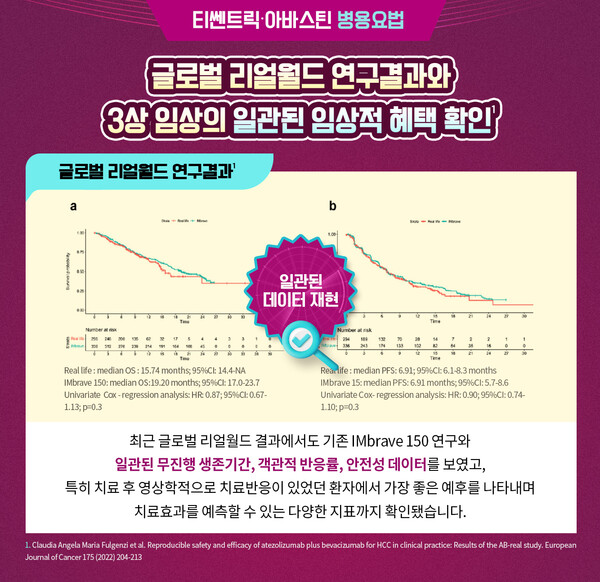 이처럼 글로벌 3상 임상연구에 이어 한국인 리얼월드 데이터, 글로벌 리얼월드 데이터까지 입증된 데이터를 속속 발표해 수준 높은 근거를 바탕으로 실제 임상 현장에서도 보다 안전하게 쓰이고 있는 티쎈트릭∙아바스틴 병용요법. 향후 전세계 진행성 간세포암 환자의 1차 치료 진료 현장에서 표준 치료요법으로 다시 한번 공고히 자리매김 할 수 있을 것으로 기대하고 있다.