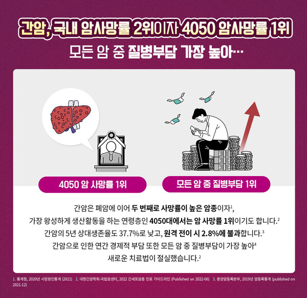 [의학신문·일간보사=김상일 기자]간암은 폐암에 이어 두 번째로 사망률이 높은 암종이자, 가장 왕성하게 생산활동을 하는 연령층인 40-50대에서는 암 사망률 1위이기도 하다. 간암의 5년 상대생존율 (2015년-2019년 기준)도 37.7%로 낮고, 원격 전이 시에는 2.8%에 불과하다.
