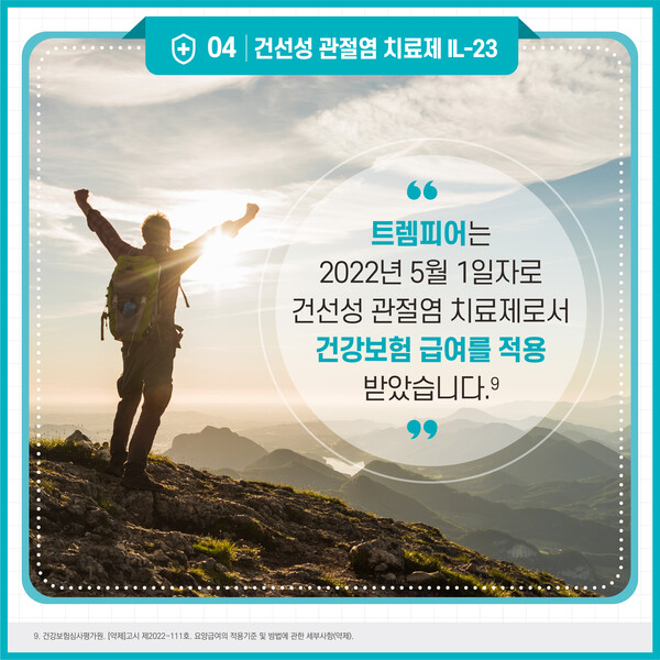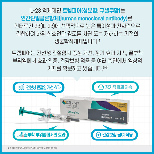 [의학신문·일간보사=김상일 기자]한국얀센 트렘피어는 인간단일클론항체로서 인터루킨23에 선택적으로 높은 특이성과 친화력으로 결합해 하위 신호전달 경로를 차단 또는 저해하는 기전의 생물학적제제이다.