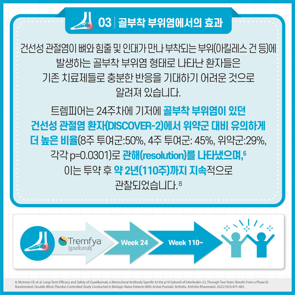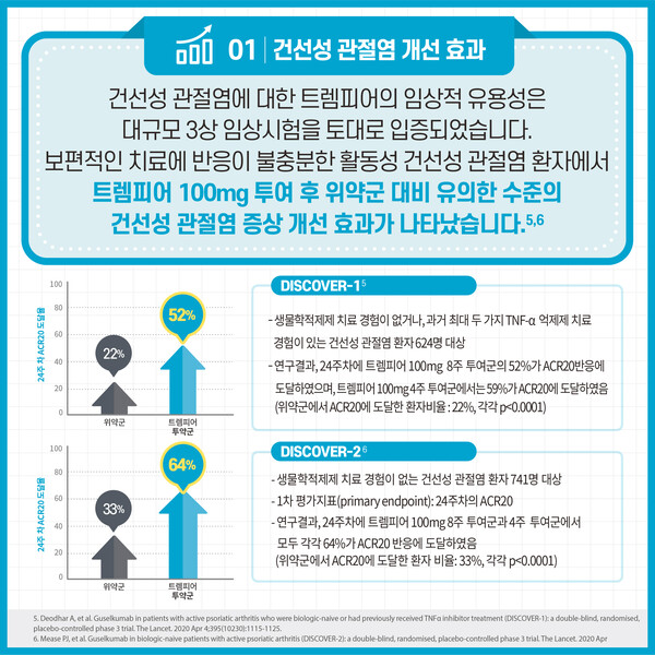 트렘피어는 건선성 관절염의 증상 개선, 장기효과 지속, 골부착 부위염에서 효과 입증, 건강보험 적용 등 여러측면에서 임상적 가치를 확보하고 있다. 특히 트렘피어는 2022년 5월 1일자로 건선성 관절염 치료제로서 건강보험급여를 받았다.