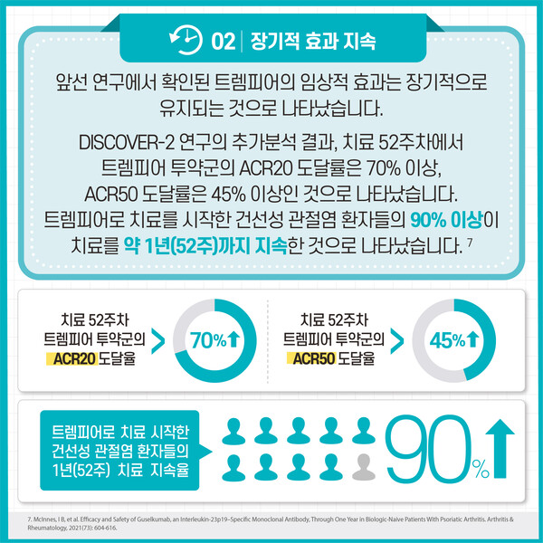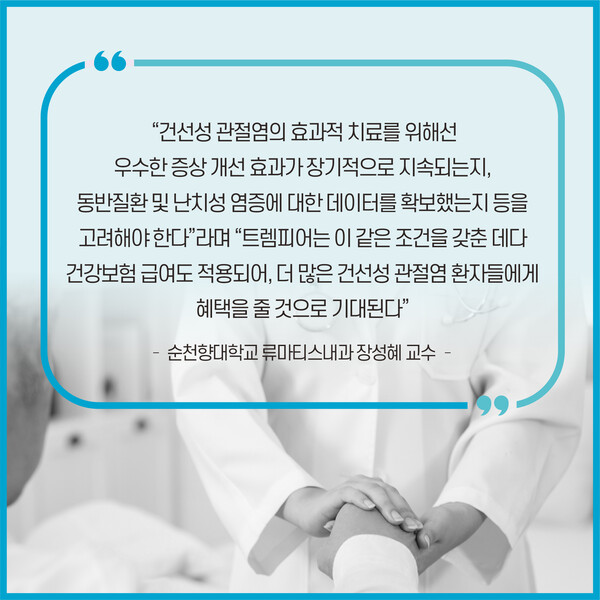 순천향대학교 류마티스내과 장성혜 교수는 "트렘피어는 우수한 증상 개선 효과 장기 지속, 동반질환 및 난치성 염증에 대한 데이터 확보 등 이같은 조건을 갖춘데다 건강보험 급여 적용도 되는 만큼 더 많은 환자들에게 혜택을 줄 것으로 기대된다"고 말했다.
