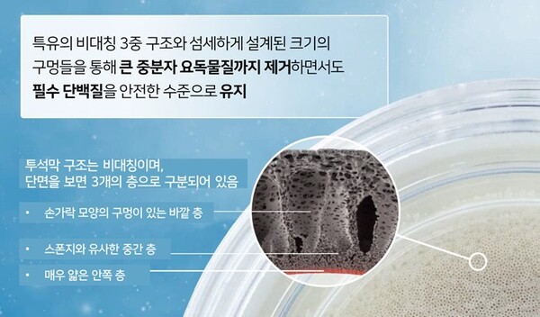 투석막 속 구멍의 크기가 점점 커져서 큰 중분자 요독물질까지 제거할 수 있는 한편, 3중 비대칭 구조를 통해 알부민 등의 필수 단백질은 유지할 수 있다.