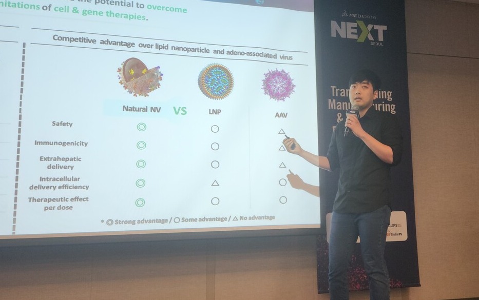그러면서 “현재 살아있는 세포를 활용한 치료제의 경우 유전자가 세포막을 통과하기 위해서는 반드시 전달체를 활용해야 하고 최근 인위적인 전달체를 사용하고 있지만 99.9% 정도가 세포소화기관을 통해 제거된다는 큰 한계점이 있다”고 지적하며 “산업계에서 ‘엑소좀’이라 부르는 자연 나노소포체인 NV가 해결할 수 있다”고 덧붙였다.