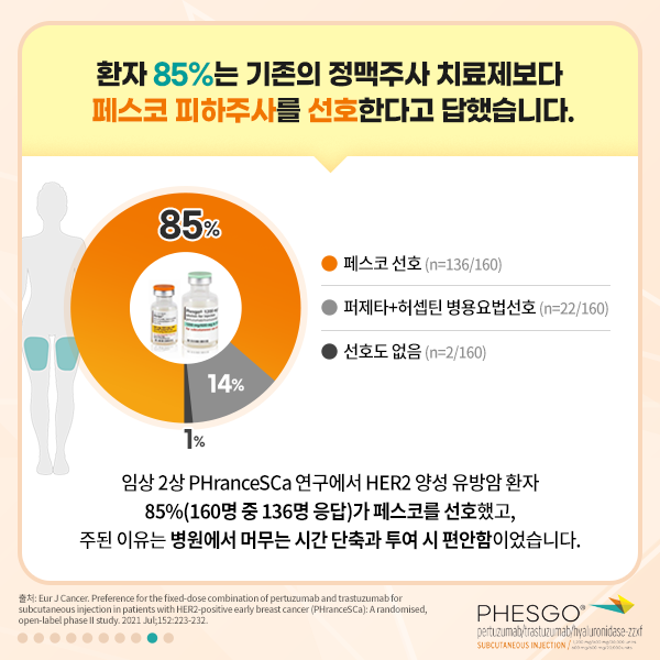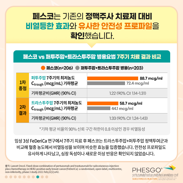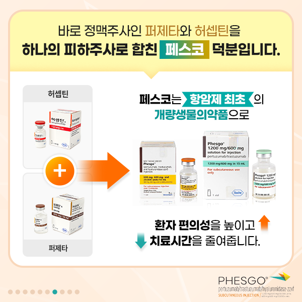 정맥주사인 퍼제타와 허셉틴을 하나로 합친 피하주사 페스코는 항암제 최초의 개량생물의약품으로, 환자 편의성을 높이고 투약 및 모니터링 시간을 약 90% 단축시킨다.