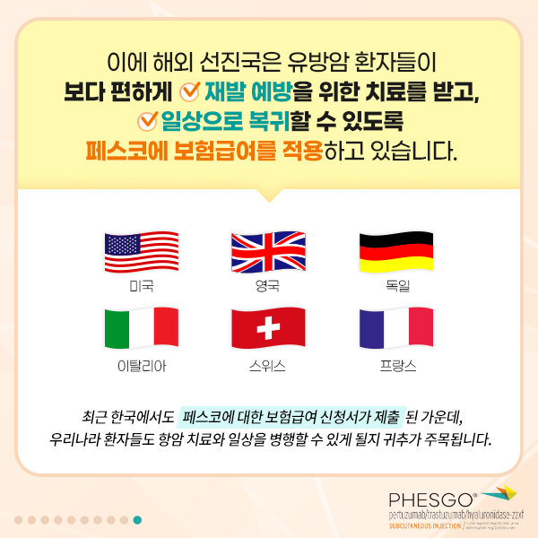 이미 미국, 영국, 독일, 이탈리아, 스위스, 프랑스 등 해외 주요 국가에서는 HER2 양성 유방암 환자가 페스코 치료를 받을 경우, 보험급여를 적용하고 있다.