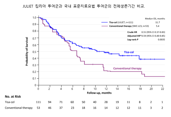 분석 결과, 기존 항암화학요법을 투여 받은 국내 환자들의 전체생존기간 중앙값은 5.4개월로 나타났으며, 이는 JULIET 연구에서 보고된 11.7개월보다 더 낮았다. 기존 항암화학요법 대비 티사젠렉류셀은 모든 원인으로 인한 사망 위험(HR=0.59; 95% CI: 0.40-0.85)을 낮추는 것으로 나타났다.
