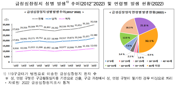 질병청·소방청은 이날 2022년 구급대가 이송한 급성심장정지환자 3만 5018명(인구10만명당 68.3명)에 대한 조사 결과를 발표했다.