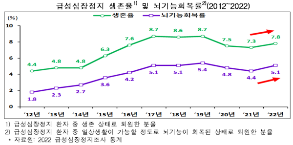 이는 코로나19가 유행했던 2020년(급성싱정지 생존율 7.5%, 뇌기능회복률 4.8%)과 2021년(7.3%, 4.4%)보다 증가한 수준이나, 아직 2019년(8.7%, 5.4%)에는 조금 못 미치는 수준이다.