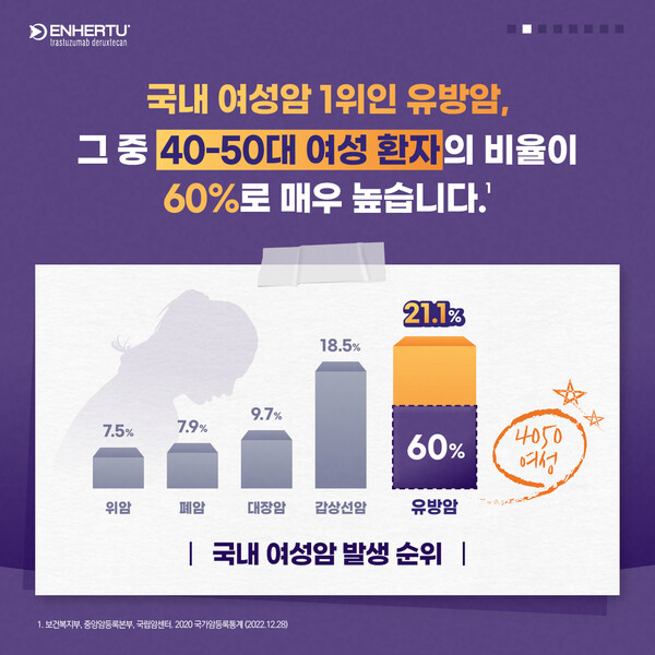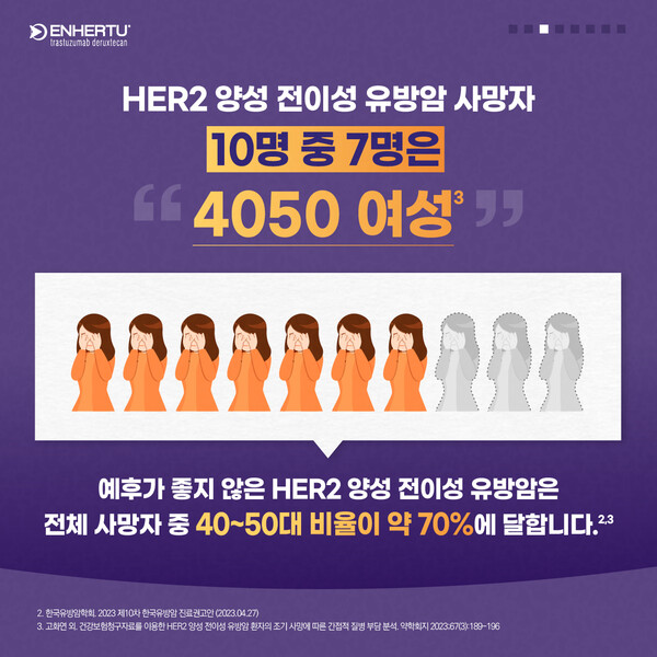 [의학신문·일간보사=김상일 기자]유방암 중 HER2 양성 유방암은 HER2 음성 유방암 대비 재발 및 전이가 잘 나타나고, 진행 속도가 빨라 예후가 더욱 좋지 않은 것으로 알려져 있다. 이러한 HER2 양성 전이성 유방암 환자의 전체 사망자 10명 중 7명은 ‘40~50대 여성’이다.