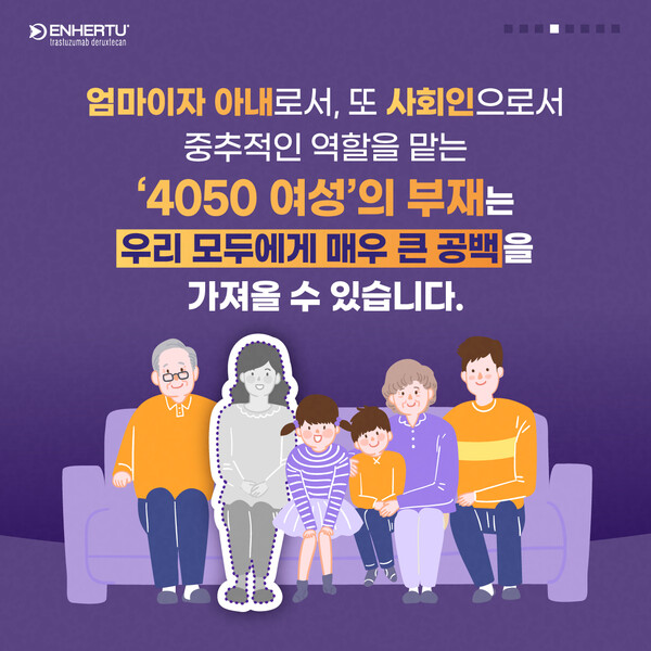 엄마이자 아내로서, 또 사회인으로서 가정과 사회에서 중추적인 역할을 맡고 있는 ‘4050 여성’의 부재는 우리 모두에게 매우 큰 공백을 가져올 수 있다. 이는 결과적으로 환자 개인과 가정의 안녕뿐만 아니라 사회적·경제적으로도 크나큰 손실을 야기하게 된다.