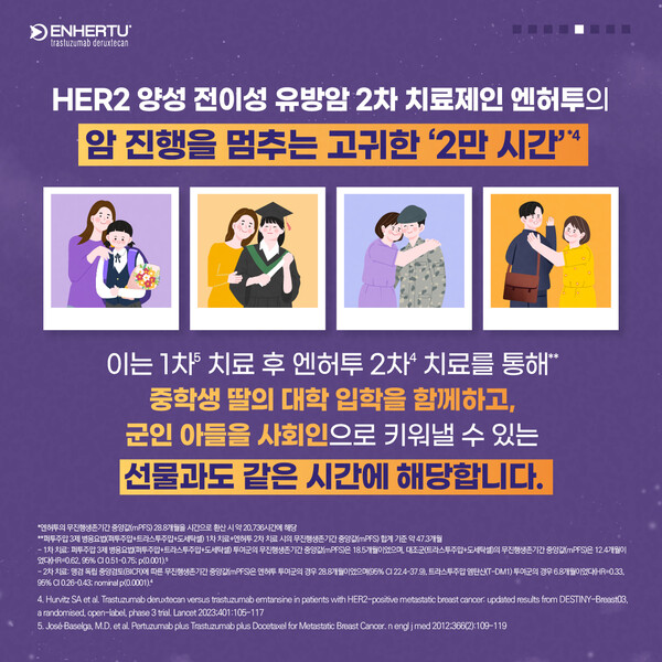 엔허투가 연장시킨 HER2 양성 전이성 유방암 환자의 무진행생존기간 중앙값 28.8개월을 시간으로 환산하면 약 2만 736시간에 달한다. 4050 여성 유방암 환자가 1차 치료 후 엔허투 2차 치료를 받을 경우, 중학생 딸의 대학 입학을 함께하고, 군인 아들을 든든한 사회인으로 키워내는 등 약 4년에 달하는 ‘선물’과도 같은 시간을 보낼 수 있다.