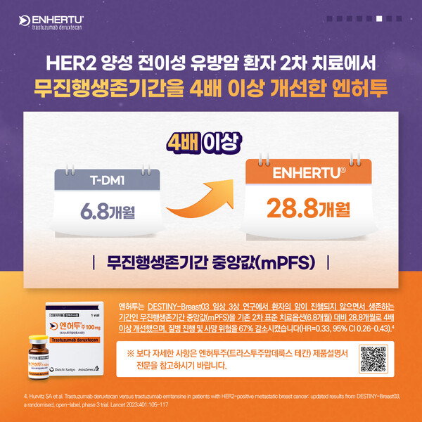 DESTINY-Breast03 임상 3상 연구에 따르면, 엔허투는 환자의 무진행생존기간 중앙값을 기존 2차 표준 치료옵션 6.8개월 대비 28.8개월로 4배 이상 개선했으며, 질병 진행 및 사망 위험을 67% 감소시켰다.