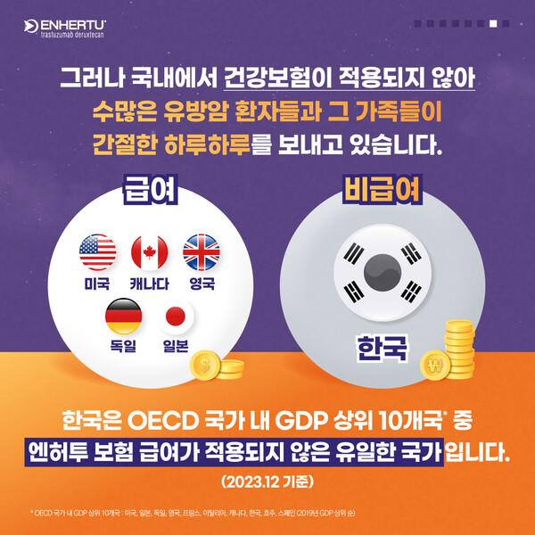 이러한 혁신 신약 엔허투에 대해 미국, 캐나다, 영국, 독일, 일본 등 주요 선진국에서는 이미 급여 적용이 이루어진 반면, 국내에서는 아직 엔허투에 대한 건강보험이 적용되지 않고 있다. 현재 한국은 OECD 국가 내 GDP 상위 10개국 중 엔허투의 보험 급여가 적용되지 않은 유일한 국가이다.