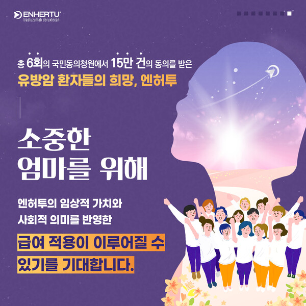 엔허투는 국내 식품의약품안전처 허가 이전부터 현재까지, 그동안 총 6회의 국민동의청원에서 15만 건의 동의를 받는 등 유방암 환자들의 간절한 ‘희망’이 되고 있다. 누군가의 소중한 엄마이자, 아내, 딸인 전이성 유방암 환자들을 위해 엔허투의 임상적 가치와 사회적 의미를 반영한 급여 적용이 이루어질 수 있기를 기대한다.