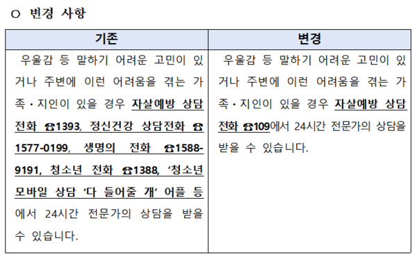 이와 함께 복지부는 자살 사건 보도시 상담사건 안내를 변경된 109번으로 해줄 것을 협조요청하는 한편, 자살보도권고기준 개정 추진 계획을 밝히기도 했다.