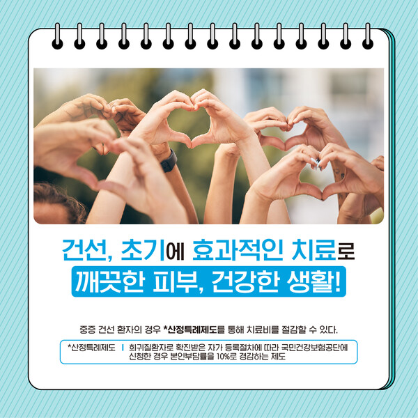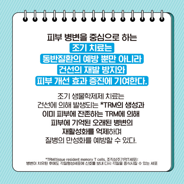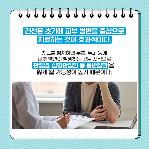 건선은 초기에 피부 병변을 중심으로 치료하는 것이 효과적이다. 치료를 방치하면 무릎, 두피 등에 피부 병변이 발생하는 것을 시작으로 관절염, 심혈관질환 등 동반질환을 앓게 될 가능성이 높기 때문이다.
