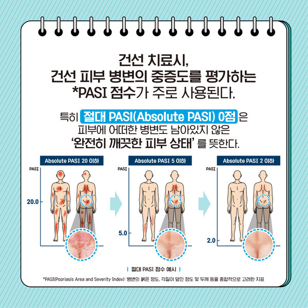 건선 치료 시, 건선 피부 병변의 중증도를 평가하는 PASI 점수가 주로 사용된다. 특히 절대 PASI(Absolute PASI) 0점은 피부에 어떠한 병변도 남아있지 않은 ‘완전히 깨끗한 피부 상태’를 뜻한다.