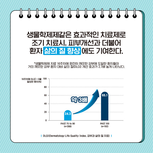 생물학제제 같은 효과적인 치료제로 조기 치료 시, 피부개선과 더불어 환자의 삶의 질 향상에도 기여한다. 생물학제제 치료 16주 차에 완전히 깨끗한 피부에 도달한 환자들이 거의 깨끗한 피부 환자 대비 삶의 질 개선 효과가 2.7배 높게 나타났다.