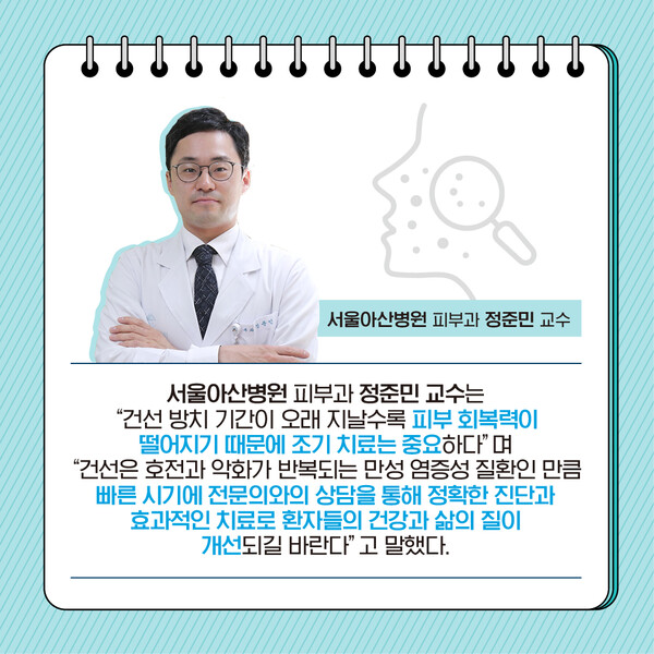 서울아산병원 피부과 정준민 교수는 “건선 방치 기간이 오래 지날수록 피부 회복력이 떨어지기 때문에 조기 치료는 중요하다”며 ”건선은 호전과 악화가 반복되는 만성 염증성 질환인 만큼 빠른 시기에 전문의와의 상담을 통해 정확한 진단과 효과적인 치료로 환자들의 건강과 삶의 질이 개선되길 바란다”고 말했다.