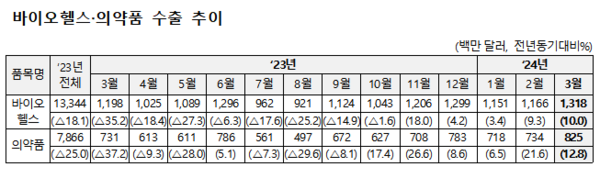 3월 바이오헬스 수출액은 13억 1800만달러로 전년(11억 9800만달러) 동기대비 10.0% 증가했으며, 5개월째 흑자를 이어가고 있다.
