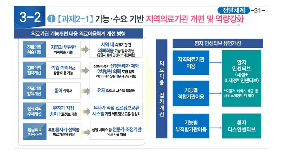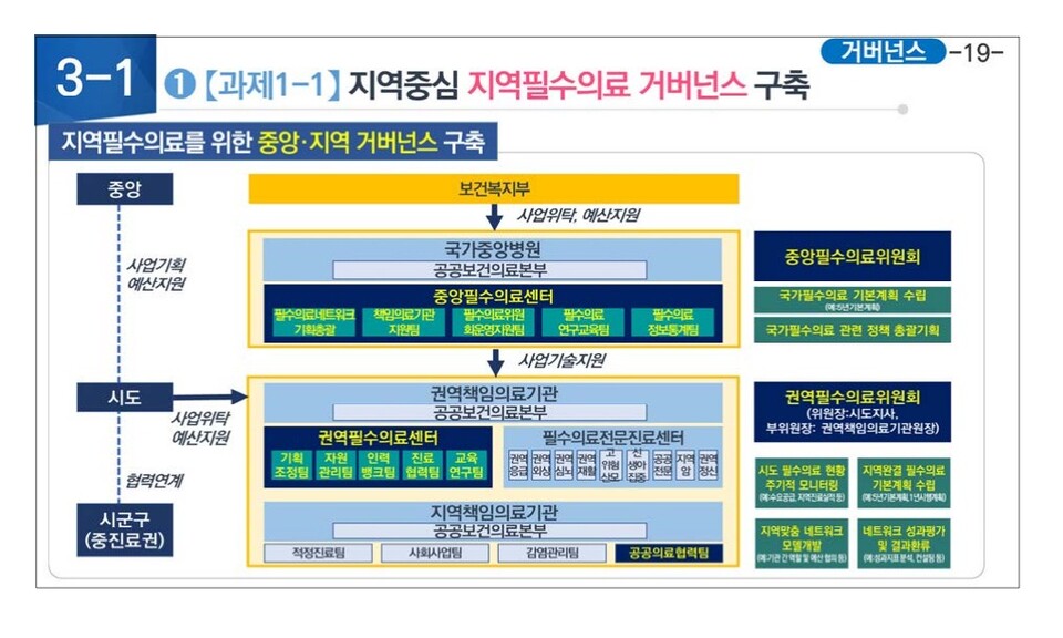 필수의료 거버넌스를 구축하고 지역의료 수준을 높이기 위해 권역 책임의료기관의 역할 및 권한을 강화하며, 진료의뢰회송 제도의 개편과 인센티브 제공을 통해 환자 의료이용을 개선하는 것이 큰 골자다.