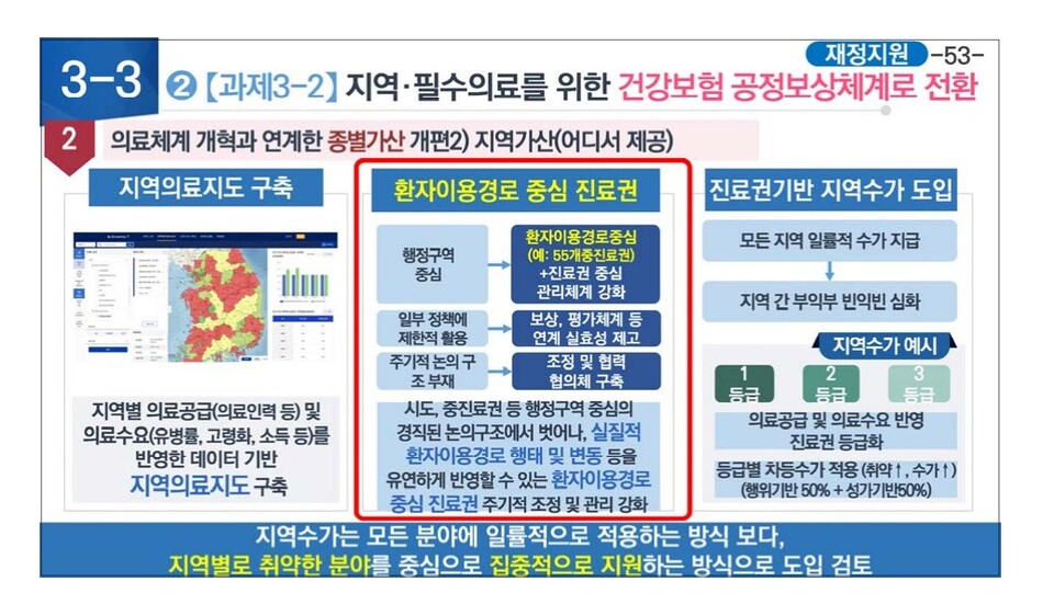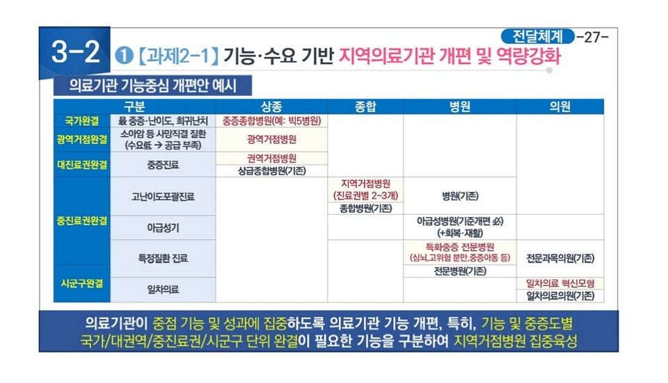또한 신 위원은 기능 및 수요 기반으로 지역의료기관을 개편해야 한다고 말했다. 그는 “의료기관이 중점 기능과 성과에 집중하도록 개편하고, 특히 기능 및 중증도별로 국가, 대권역, 중진료권, 시군구 단이 완결이 필요한 기능을 구분해 지역거점병원을 육성해야 한다”고 언급했다.