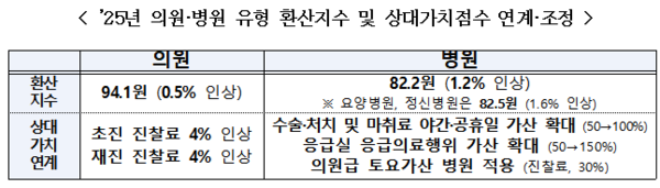이에 따라 의원급에서는 0.5%인상과 초진·재진 진찰료 4% 인상이, 병원급에서는 1.2% 인상과 수술·마취 및 응급실 등 가산이 함께 적용되게 됐다.