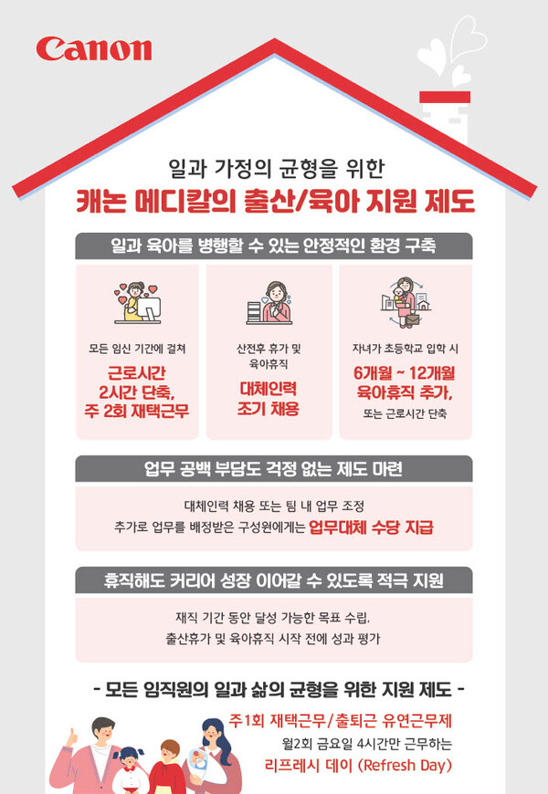 이를 통해 휴직한 임직원들이 평가나 보상제도의 불이익을 받지 않고 커리어 성장을 이어갈 수 있도록 적극 지원한다. 캐논 메디칼의 육아 및 출산 지원 제도는 파견직까지 모두 동일한 혜택을 누릴 수 있도록 시행되고 있다.