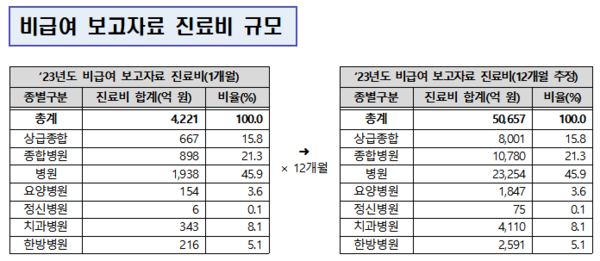 이를 연간(12개월) 규모로 환산하면 총 5조657억원이며, 주요 종별 연간 진료비 추정액은 병원 2조3254억원, 종병 1조780억원, 상급종병 8001억원이다.