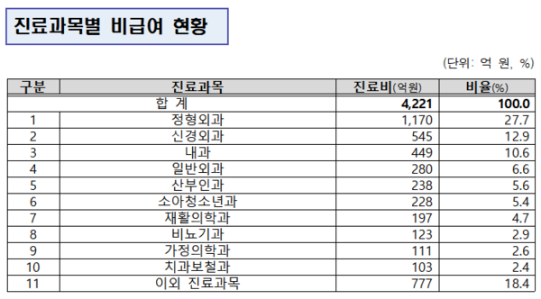 이를 연간으로 추산하면 5조원이 넘는 금액이며, 진료과목으로는 정형외과·신경과·내과가, 항목으로는 도수치료 등 10개 주요 항목들이 절반 가까이 차지했다.