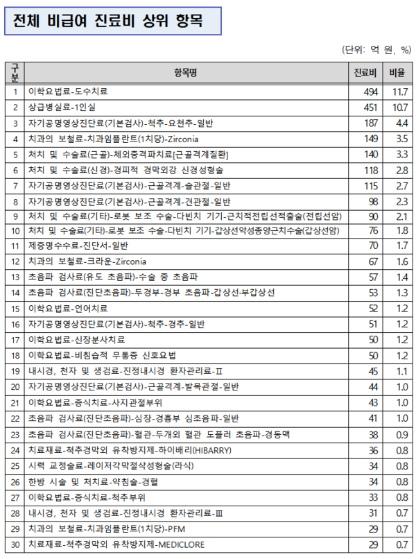 항목별 진료비 규모는 도수치료가 494억 원(11.7%)으로 가장 컸으며, 1인실 상급병실료 451억원(10.7%), 척추-요천추 MRI 187억원(4.4%) 등 상위 10개 항목이 전체 비급여 진료비의 45.3%를 차지했다. 상위 10개 항목은 ▲도수치료 ▲1인실 상급병실료 ▲척추요천추 MRI ▲치과임플란트 ▲체외충격파치료 ▲경피적 경막외강 신경성형술 ▲근골격계슬관절 MRI ▲근골격계견관절 MRI ▲전립선암 로봇보조수술 ▲갑상선암 로봇보조수술이다.