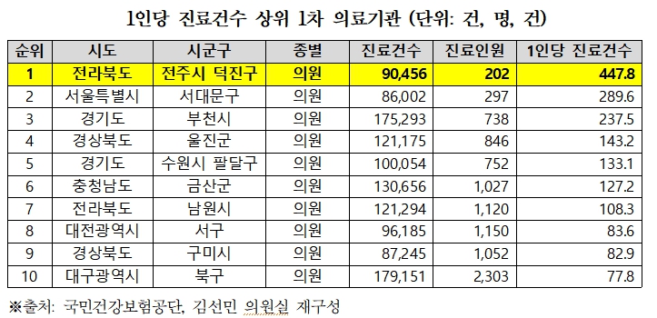전북 전주시 의원급 의료기관, 1명당 447.8회 진료