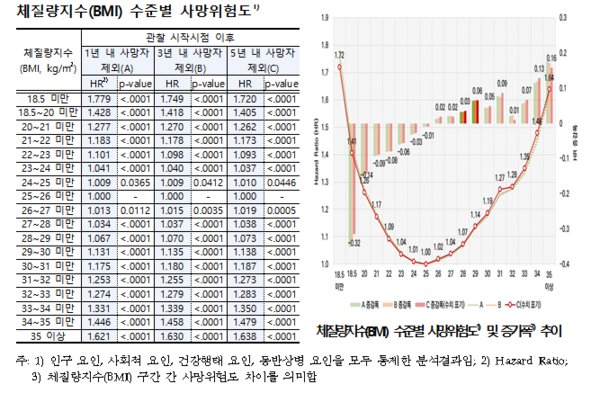 관찰 시작시점 이후 5년 내 사망자를 제외한 분석결과, BMI 25 구간에서 사망위험이 가장 낮고, BMI 18.5 미만과 BMI 35 이상에서 사망위험이 가장 높았다(BMI 25 구간 대비 각각 1.72배, 1.64배).