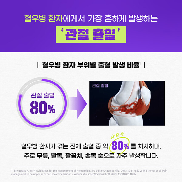 [의학신문·일간보사=김상일 기자]혈우병 환자에게서 가장 흔하게 발생하는 출혈은 ‘관절 출혈’이다. 관절 출혈은 혈우병 환자가 겪는 전체 출혈 중 약 80%를 차지하며, 주로 무릎, 발목, 팔꿈치, 손목 순으로 자주 발생한다.