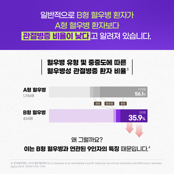 일반적으로 A형 혈우병(혈액응고인자 8인자 결핍) 환자는 B형 혈우병(혈액응고인자 9인자 결핍) 환자보다 평균 출혈 횟수와 평균 관절 수술 횟수가 많은 것으로 알려져 있다.