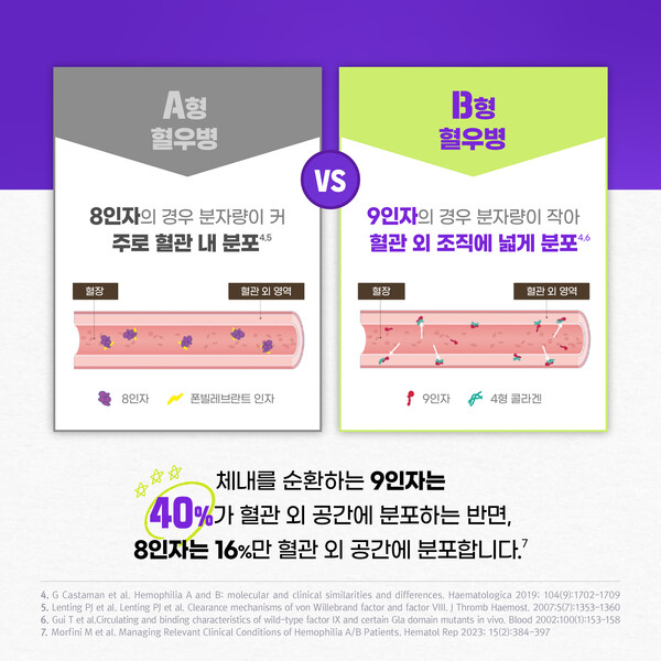 그 이유는 혈액응고인자 8인자의 경우 분자량이 커 혈관 내에 주로 분포하는 반면, 혈액응고인자 9인자는 분자량이 작아 조직, 근육, 관절 등 혈관 외 영역으로 빠져나가기 때문이다. 혈액응고인자 9인자의 40%가 혈관 외 조직에 분포하는 반면, 혈액응고인자 8인자는 16%만이 혈관 외 조직에 분포하는 것으로 나타났다.