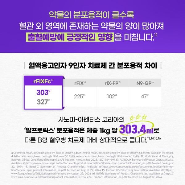 사노피-아벤티스 코리아의 B형 혈우병 반감기 연장 제제 ‘알프로릭스’의 분포용적은 체중 1kg 당 303.4mL로, 다른 B형 혈우병 치료제와 비교했을 때 상대적으로 분포용적이 큰 편이다.