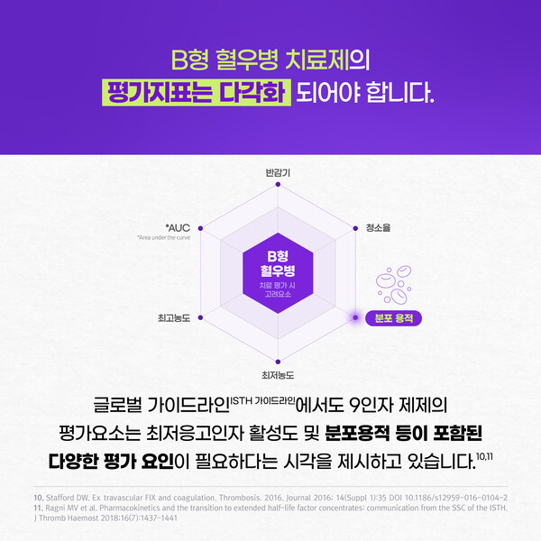 이에 따라 국제혈전지혈학회의 혈액응고인자8인자, 8인자, 희귀 출혈 장애 관련 소위원회가 2018년에 발간한 가이드라인에서는 혈액응고인자 9인자 제제의 평가 요소로 최저 응고인자 활성도 및 분포용적 등을 포함한 다양한 평가 요인이 필요하다는 시각을 제시하고 있다.