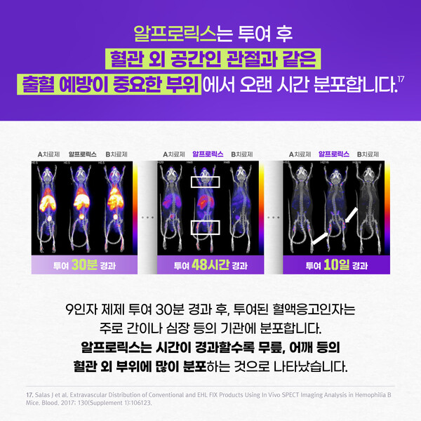 이에 따라 알프로릭스를 투여한 군에서는 다른 B형 혈우병 치료제를 투여한 군보다 혈관 외 분포가 활발해 관절에 머무르는 양이 많은 것으로 확인됐다.