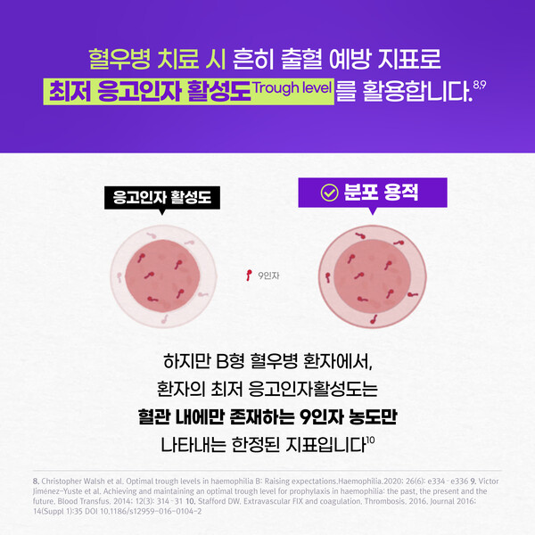 혈우병 치료 시 흔히 출혈 예방 지표로 투여 후 최저 응고인자 활성도를 활용한다. 하지만 B형 혈우병 환자에게서 측정한 혈액응고인자 9인자의 최저 응고인자 활성도는 혈관 내 분포하는 9인자 활성도에 한정된 지표이다.